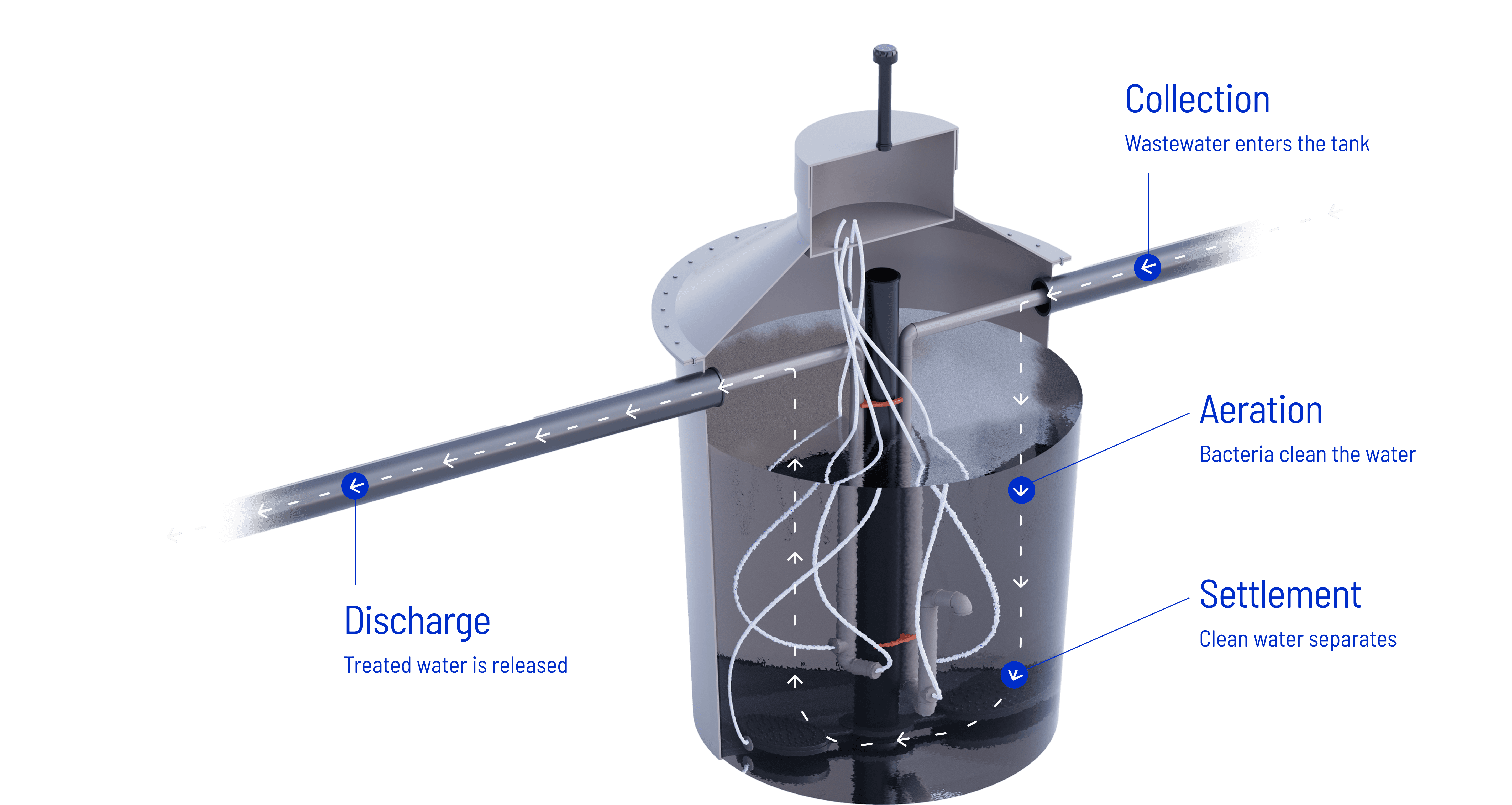 The system treats wastewater through a sequence of filling, aeration, settling and discharge. During aeration, natural microorganisms break down organic pollutants and nutrients using oxygen. Once treatment is complete, clean water separates naturally from the activated sludge and is released for infiltration or irrigation.