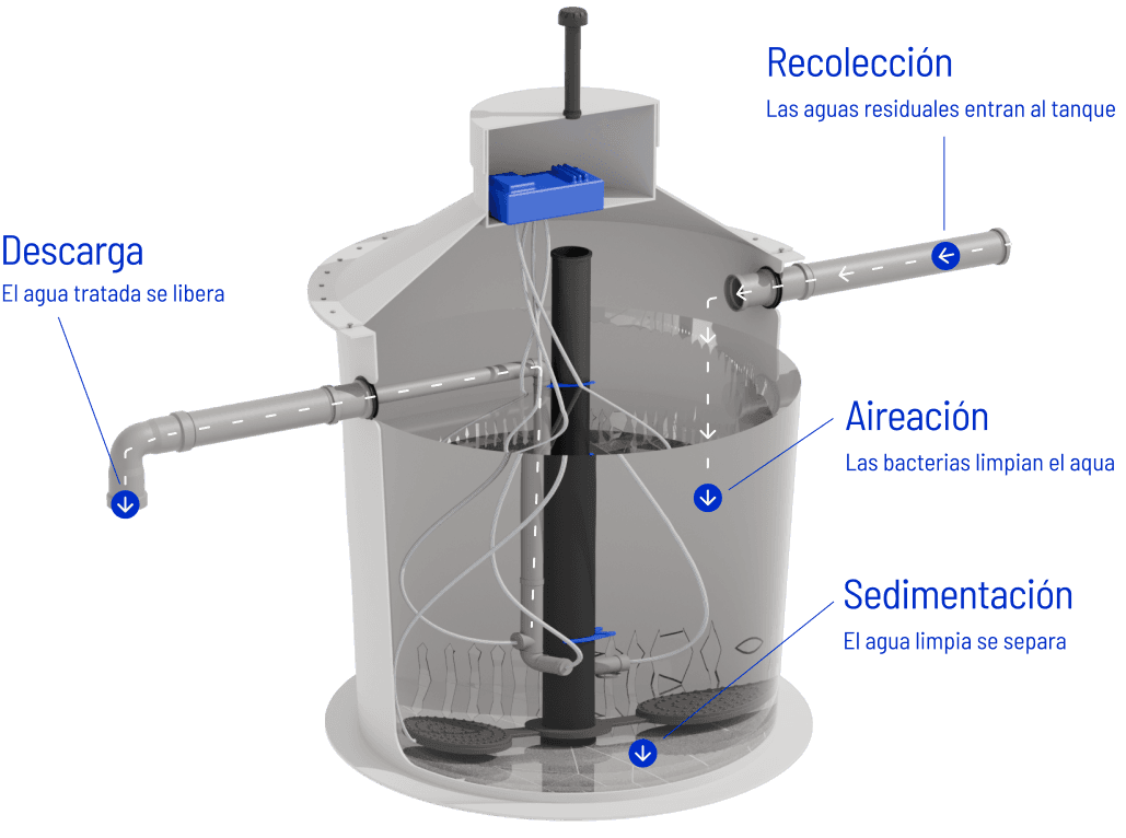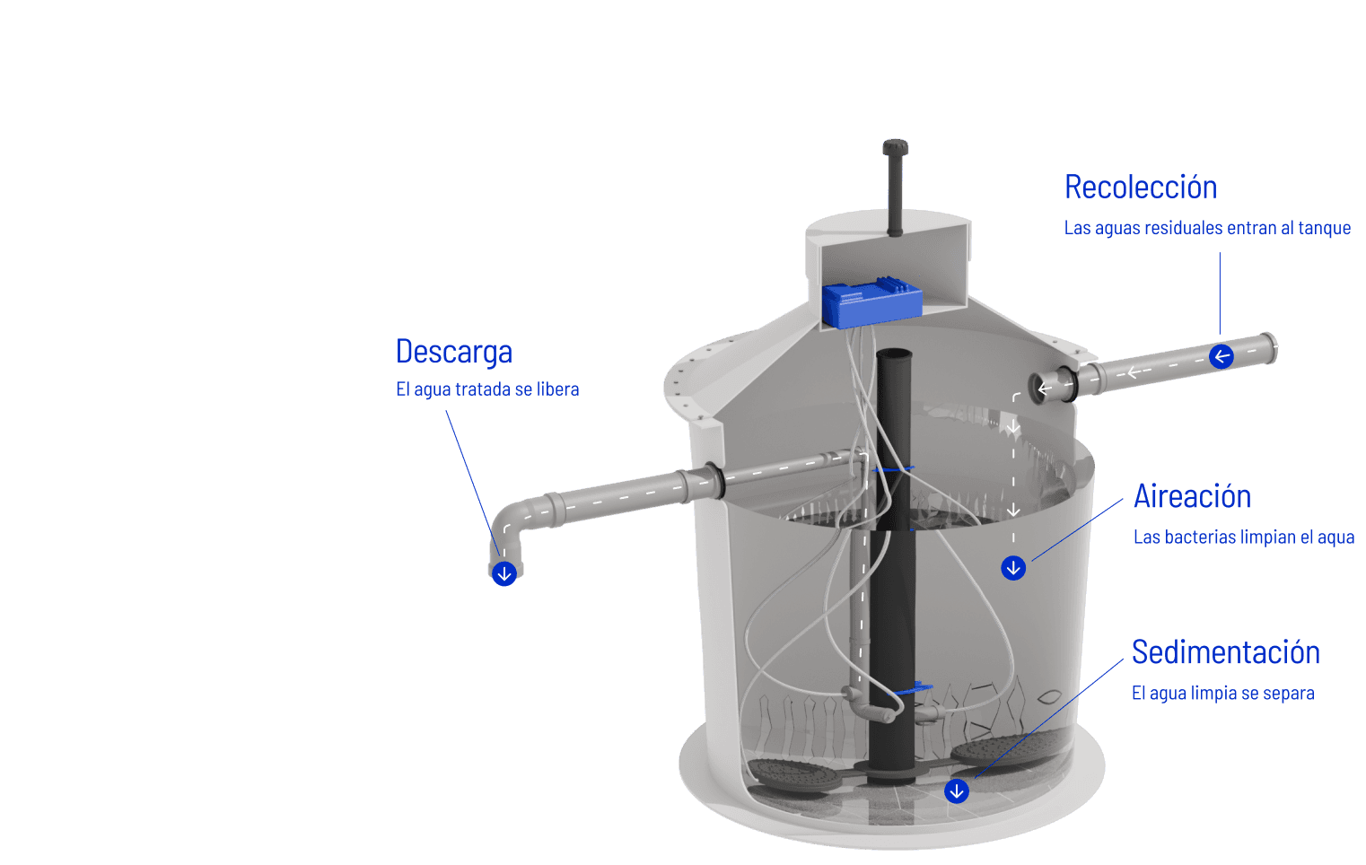 Nuestro sistema trata las aguas residuales a través de un proceso de llenado, aeración, sedimentación y descarga. Durante la aeración, microorganismos naturales descomponen los contaminantes orgánicos y los nutrientes usando oxígeno. Una vez completado el tratamiento, el agua limpia se separa de forma natural del sedimento activado, lista para ser liberada y usada para infiltración o riego.